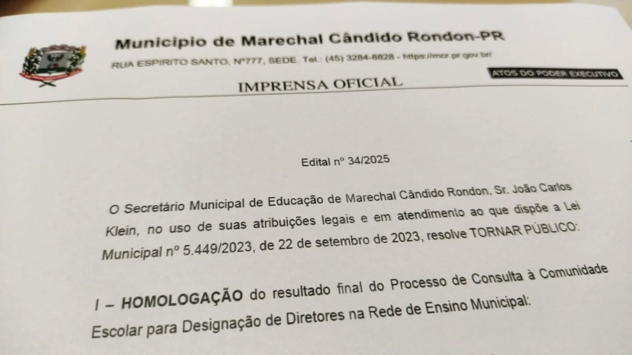 A Secretaria Municipal de Educação de Marechal Cândido Rondon publicou nesta sexta-feira (24), no Diário Oficial Eletrônico do município, a homologação do resultado final do processo de consulta à comunidade escolar para a designação de diretores da rede municipal de ensino. A divulgação foi oficializada por meio de ato do secretário municipal de Educação, João Carlos Klein, com base na Lei Municipal nº 5.449/2023, de 22 de setembro de 2023.