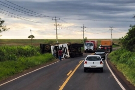 Caminhão tomba e bloqueia parte da PR-364 em curva perigosa em Terra Roxa
