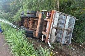 Carreta com carga de porcos tomba na Serrinha da BR-163 entre Mercedes e Guaíra