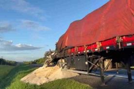 Caminhão carregado com arroz pega fogo na BR-277 após superaquecimento da lona de freio