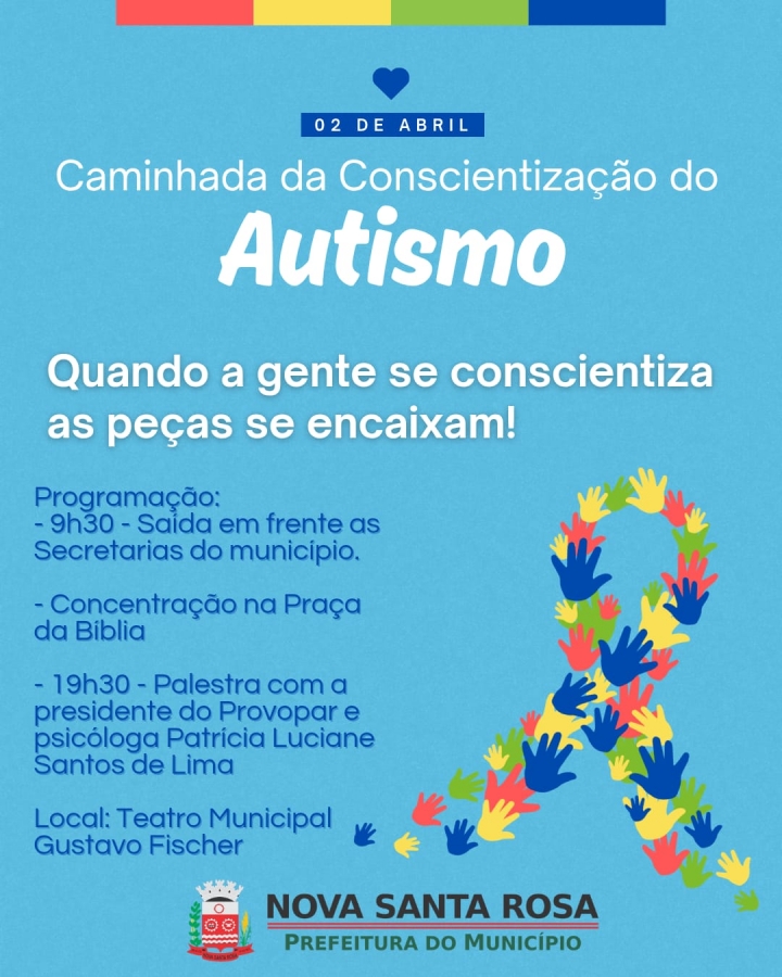 A Prefeitura de Nova Santa Rosa, por meio das Secretarias de Educação e Cultura e Assistência Social, com o apoio de demais pastas, educandários e entidades, realizará ações em alusão ao Dia Mundial de Conscientização sobre o Autismo, celebrado no dia 02 de abril. O tema deste ano será “Quando a gente se conscientiza as peças se encaixam”.