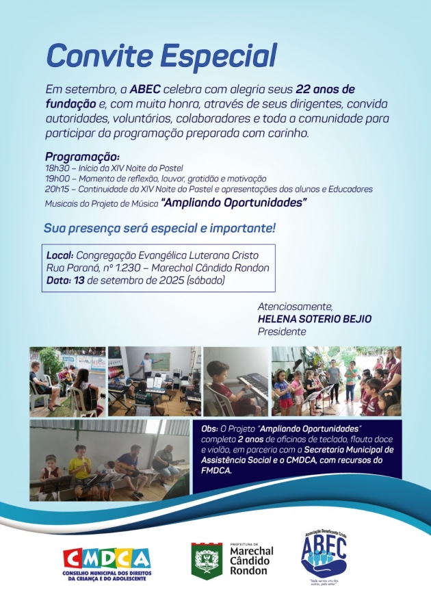Quando foi fundada, em 2003, a Associação Beneficente Cristo – ABEC tinha o firme propósito em dar continuidade aos trabalhos iniciados dentro da Congregação Evangélica Luterana Cristo, que era o atendimento a famílias e pessoas necessitadas e em situação de vulnerabilidade. Hoje, passados 22 anos, ela não só continua com este trabalho, mas ampliou suas ações para outras áreas e segmentos, que beneficiam a comunidade rondonense e procuram fortalecer o crescimento pessoal e retorno aos beneficiários diretos.