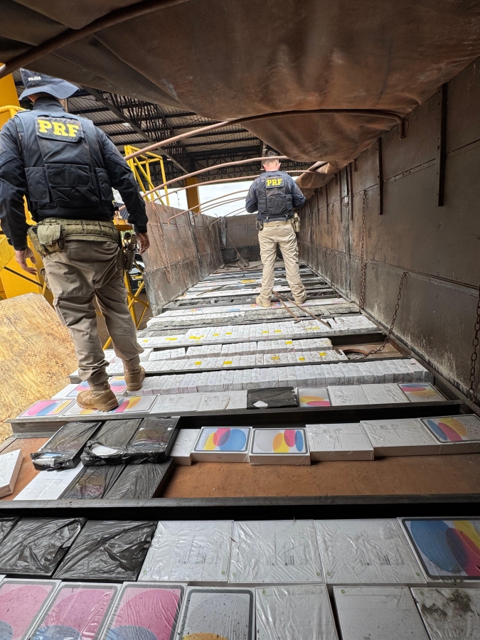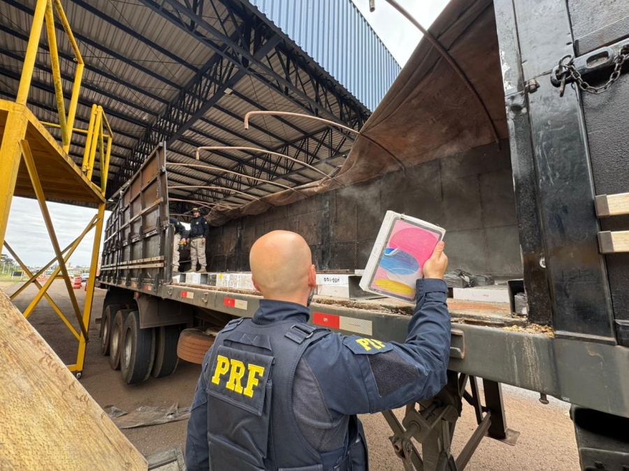 Por volta das 10h30, uma equipe da PRF abordou uma carreta conduzida por um homem de 48 anos. Durante a verificação, os policiais constataram que o veículo transportava uma carga de celulares e tablets ocultos sob o assoalho do semirreboque.