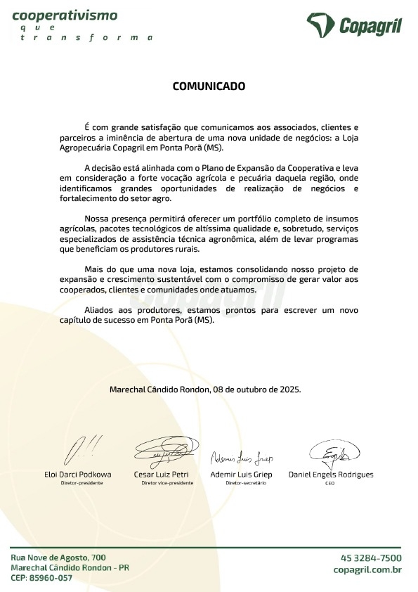 Com essa nova expansão, a Copagril reforça sua presença no Mato Grosso do Sul e segue firme no propósito de unir produtividade, tecnologia e sustentabilidade, além de princípios que sustentam o cooperativismo, transformam realidades e impulsionam o desenvolvimento no campo.