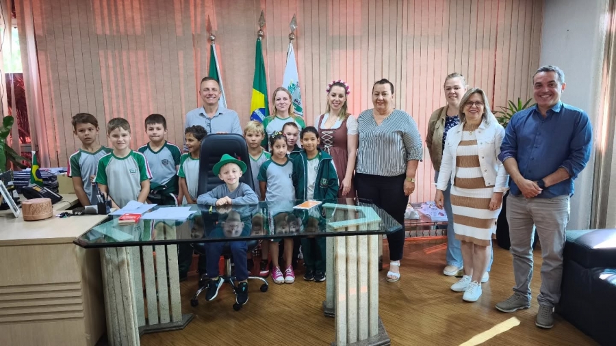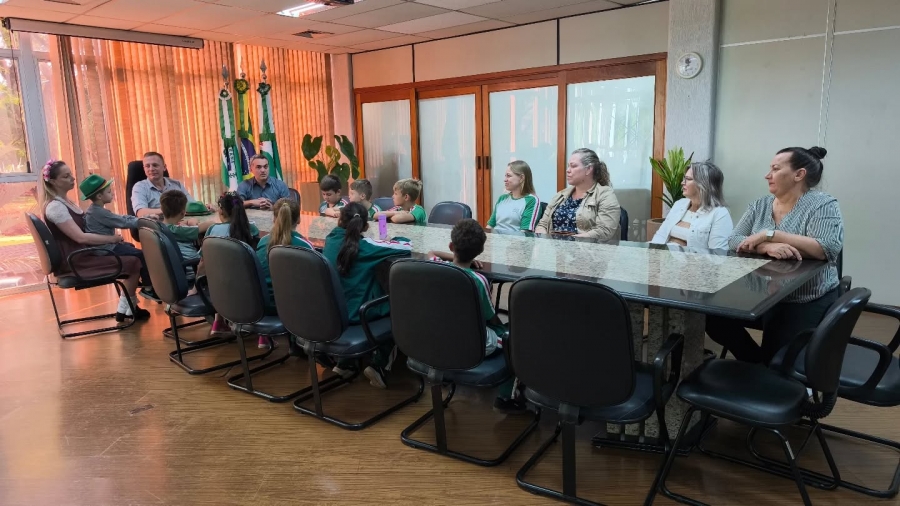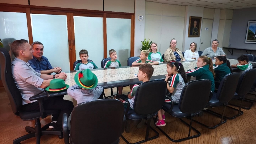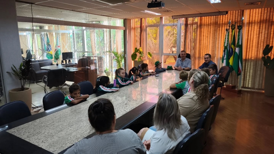 Eles foram recebidos pelo vice-prefeito Vanderlei Sauer, e estiveram presentes a secretária de Cultura, Elenice Sauer, o vereador Juliano Oliveira, a diretora de Gabinete, Lúcia Galeski, além da coordenadora da escola, Rosângela, e das assessoras da Secretaria de Educação, Anelise e Jusiane.