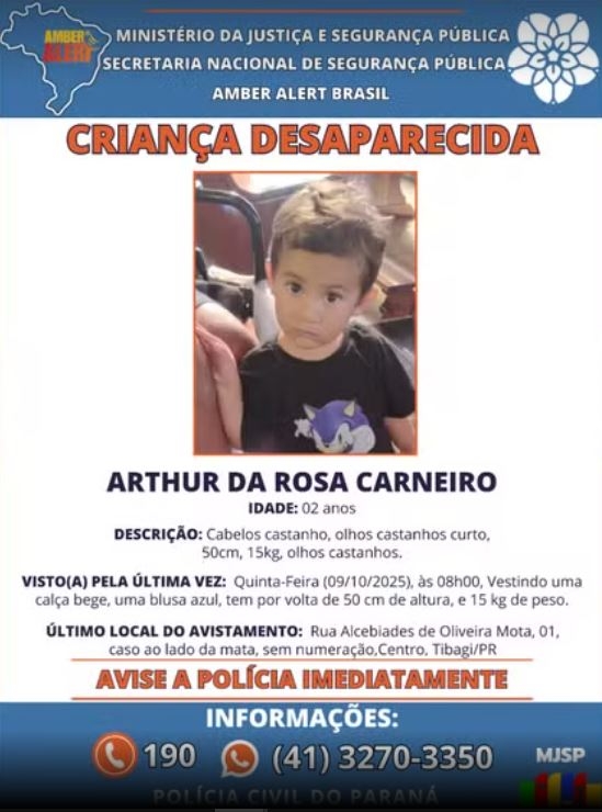 O desaparecimento de Arthur da Rosa Carneiro foi incluído no Amber Alert, sistema de alerta em redes sociais que notifica usuários que estão em um raio de 160 km de onde a pessoa foi vista pela última vez.