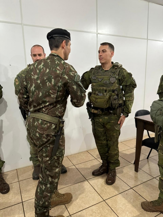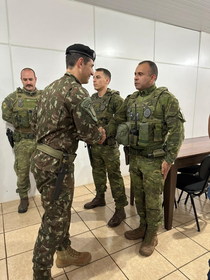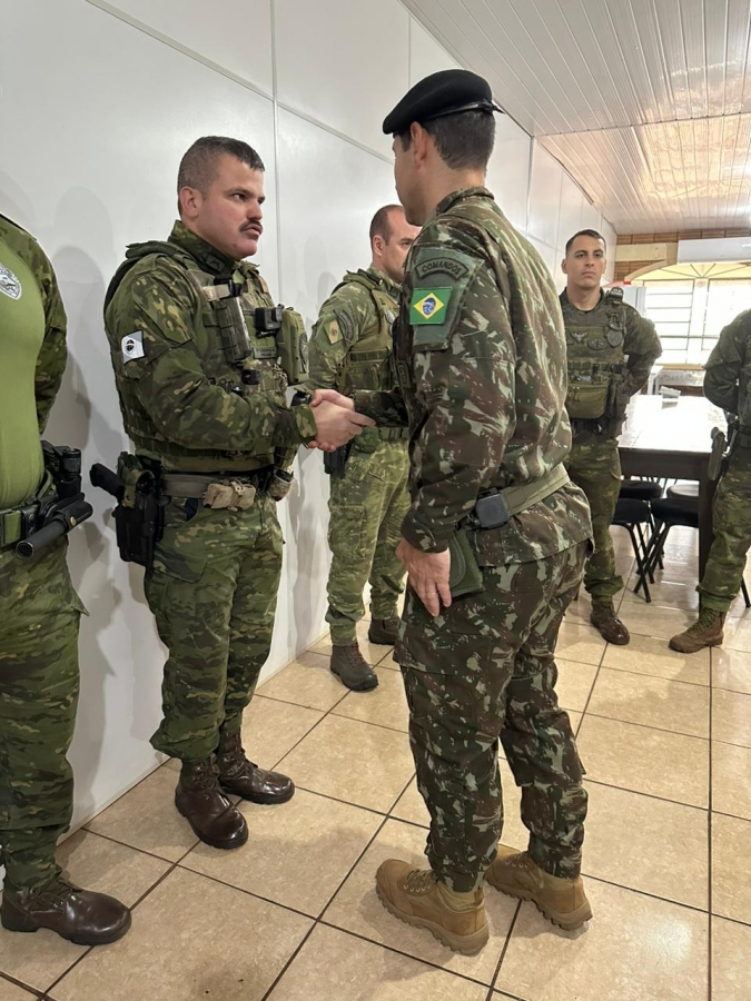 O tenente-coronel Peixoto foi recebido pelo comandante do BPFRON, Major Prado, acompanhado dos oficiais da unidade, em um momento marcado pela cordialidade e pelo reconhecimento mútuo da importância da integração entre as forças.