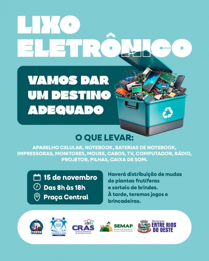 No dia 15 de novembro, a praça central de Entre Rios do Oeste será palco de uma importante ação em prol do meio ambiente. Das 8h às 18h, a população terá a oportunidade de descartar de forma adequada os aparelhos e dispositivos eletrônicos que não são mais utilizados.