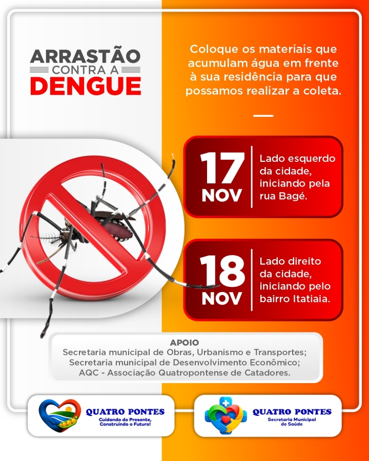 A Prefeitura de Quatro Pontes, por meio da Secretaria Municipal de Saúde, promoverá nos dias 17 e 18 de novembro de 2025 o Arrastão contra a Dengue. Trata-se de uma ação de mobilização comunitária voltada à eliminação de criadouros do mosquito Aedes aegypti — transmissor da dengue, zika e chikungunya.