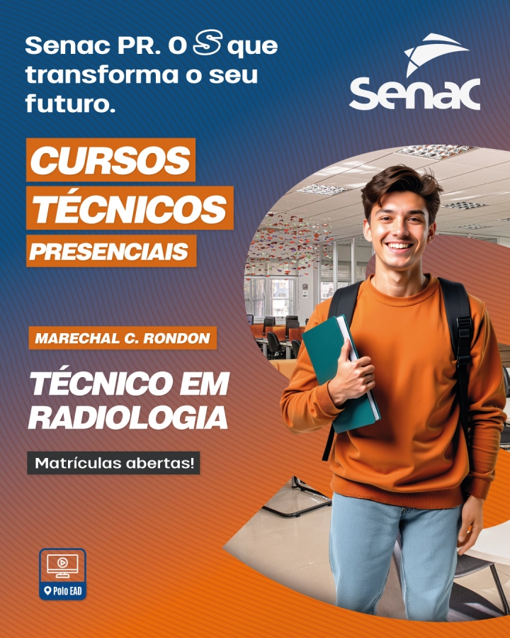 Em Marechal Cândido Rondon, o Senac está com inscrições abertas para o curso Técnico em Radiologia, que forma profissionais aptos a atuar em hospitais, clínicas e laboratórios de diagnóstico por imagem. As aulas terão início em 10 de março de 2026, com encontros presenciais de segunda a sexta-feira, das 19h às 22h. A carga horária total é de 1.600 horas, sendo 400 horas de estágio supervisionado em instituições de saúde parceiras na cidade, garantindo ao aluno experiência prática em sua formação.