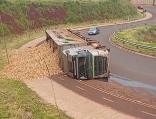 O motorista perdeu o controle da direção e tombou às margens da rodovia, deixando a carga de cavaco espalhada pelo local. Apesar do susto, o condutor não resultou com ferimentos.