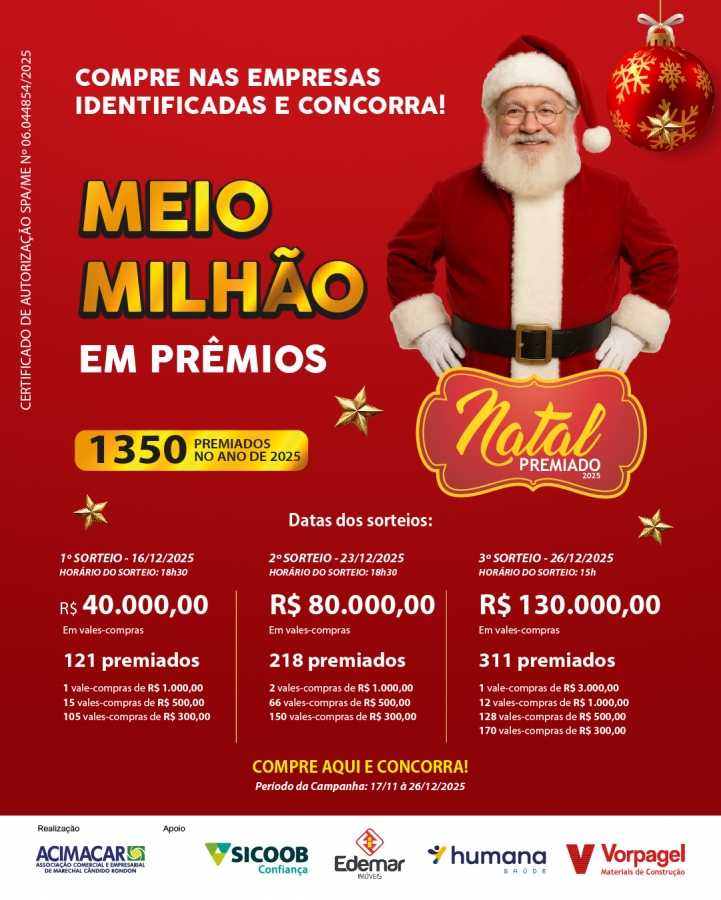 A Campanha Natal Premiado 2025 é uma realização da Acimacar, com patrocínio de Sicoob Confiança, Edemar Imóveis, Humana Saúde e Vorpagel Materiais de Construção. A campanha é legalizada pela Secretaria de Acompanhamento Fiscal, Energia e Loteria (Sefel), vinculada ao Ministério da Fazenda.