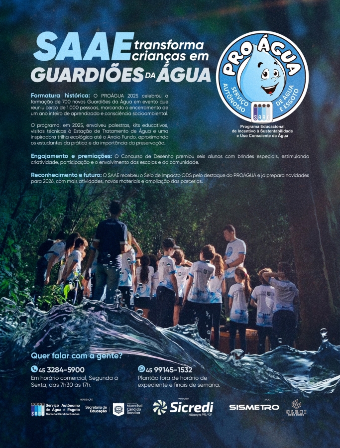 O Serviço Autônomo de Água e Esgoto (SAAE) de Marechal Cândido Rondon expressa sua profunda gratidão a todas as escolas participantes, às equipes pedagógicas e aos professores que acolheram com dedicação as atividades do PROÁGUA ao longo de 2025.