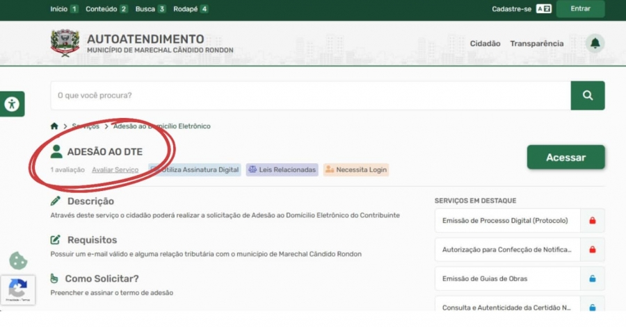 A adesão ao sistema pode ser realizada diretamente no site oficial do município, para facilitar o acesso, basta pesquisar no portal por “adesão ao DTE”, onde o contribuinte encontrará o link e todas as orientações necessárias. Para concluir o cadastro, é preciso possuir um e-mail válido. O acesso ao Portal Cidadão também pode ser feito utilizando a senha do GOV.BR, plataforma do governo federal.