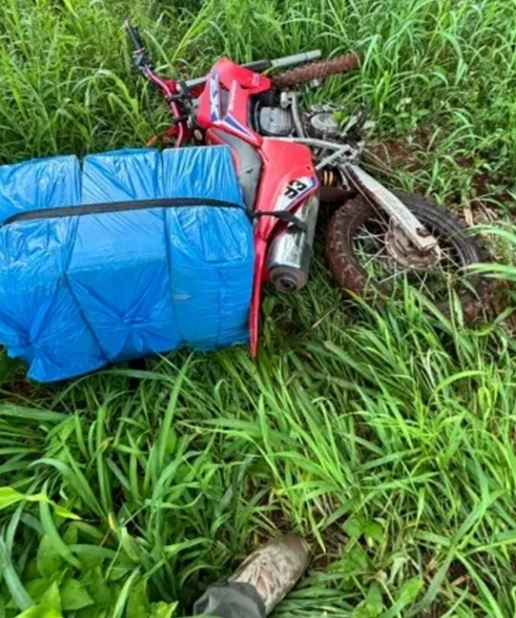 Ao receber ordem de parada, o condutor empreendeu fuga em alta velocidade por uma lavoura de soja. Em dado momento da perseguição o piloto abandonou a moto e se evadiu a pé pela mata ciliar.