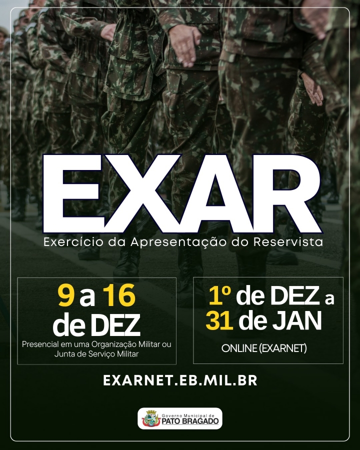 Os reservistas poderão realizar a apresentação presencialmente na Junta de Serviço Militar de Pato Bragado ou na Organização Militar mais próxima de sua residência. Além disso, é possível fazer a apresentação também online no Exarnet (https://exarnet.eb.mil.br/) de 01/12/25 a 31/01/26. Para aqueles que não conseguirem comparecer durante o período estipulado, a apresentação poderá ser feita em qualquer época do ano, porém estará sujeita ao pagamento de uma multa federal.