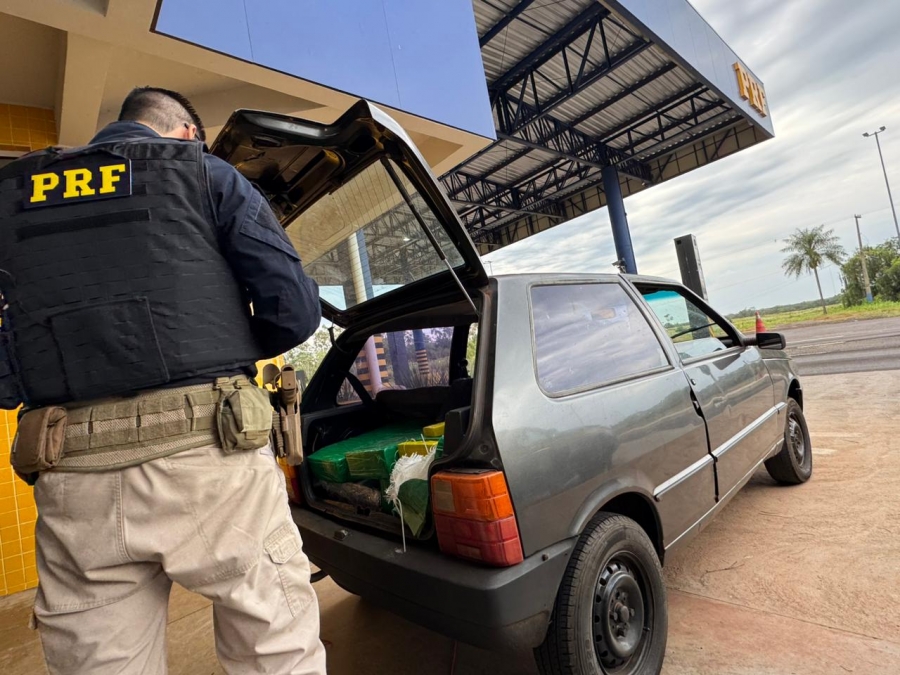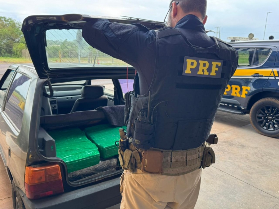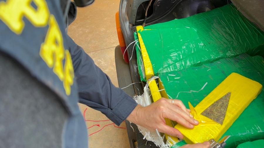Ao realizarem a vistoria no interior do automóvel, os policiais localizaram diversos fardos de maconha ocupando totalmente o porta-malas, além do assoalho do carro.