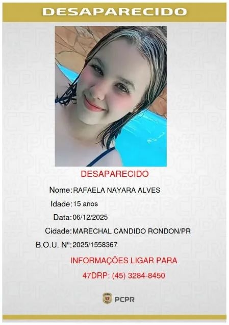 Rafaela Nayara Alves desapareceu no sábado (06). Qualquer informação sobre pode ser repassada pelo telefone (45) 3284-8450