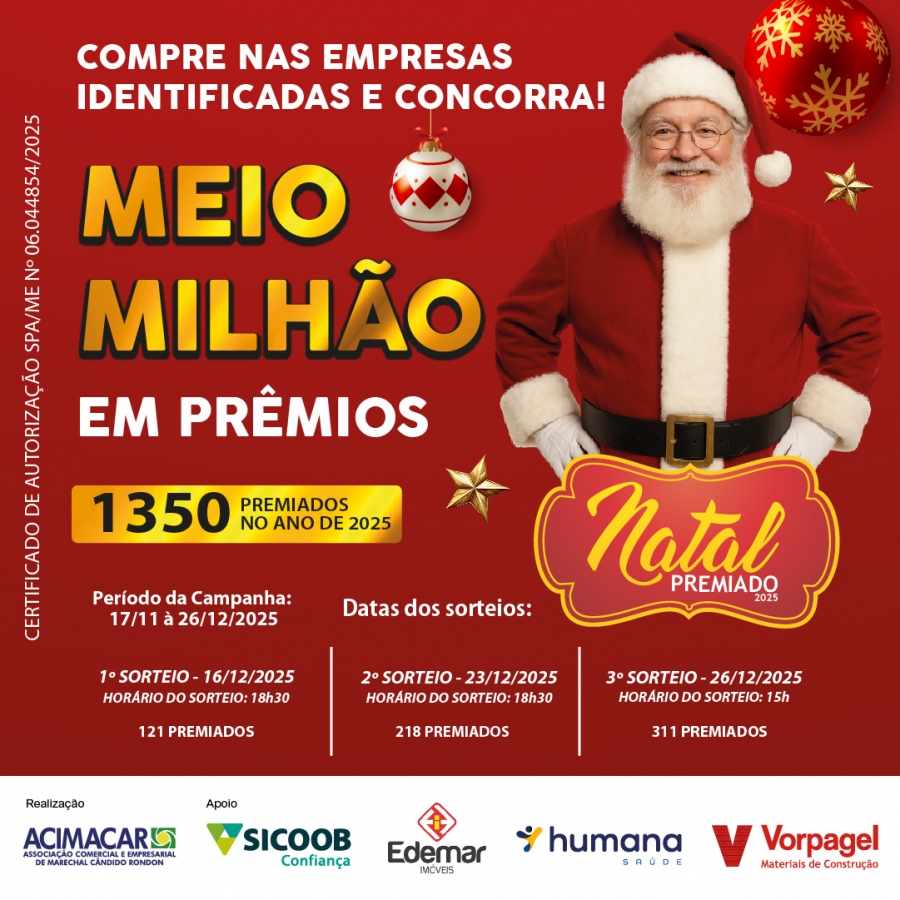 A Campanha Natal Premiado Acimacar 2025 entregará um total de R$ 250 mil em prêmios, dividido em três sorteios, sendo o segundo sorteio de R$ 80 mil e o terceiro de R$ 130 mil em vale-compras. O segundo sorteio acontece no dia 23 de dezembro, quando serão contempladas mais 218 pessoas e o terceiro sorteará 311 contemplados no dia 26 de dezembro.