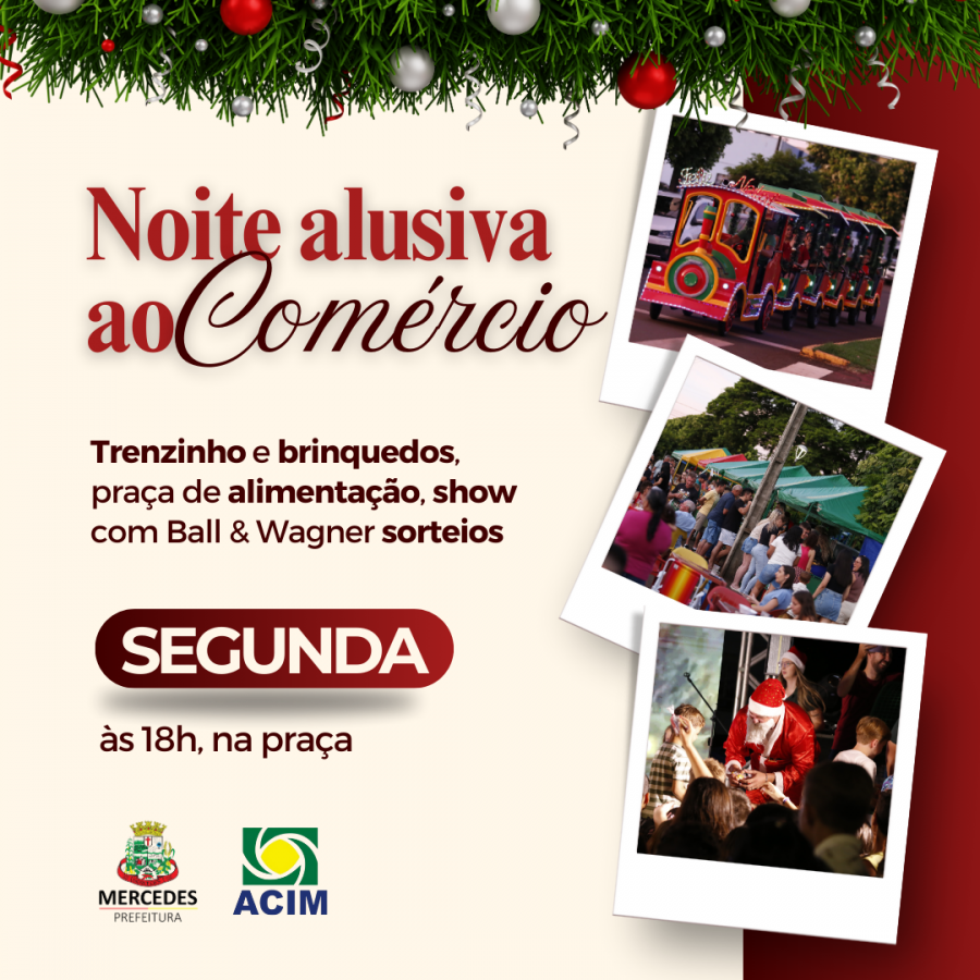 A Noite Alusiva ao Comércio integra a programação natalina do município e tem como objetivo fortalecer o comércio local, incentivar as compras em Mercedes e proporcionar momentos de lazer e confraternização à comunidade.