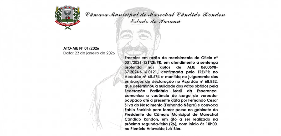 A Câmara de Vereadores de Marechal Cândido Rondon foi ágil e logo após ser notificada, já oficializou nesta sexta-feira (23) a mudança na composição do Legislativo municipal. Por meio de ato da Mesa Diretora, foi declarada a vacância do cargo ocupado até então por Fernando Nègre (PT) e convocado Fábio Fockink (PL) para tomar posse como vereador.