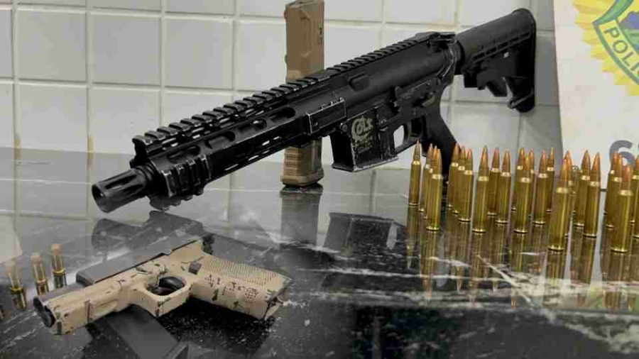 "Recebemos a denúncia e acionamos as equipes do Choque para realizar a abordagem. Durante a entrada, eles tentaram esconder as armas de fogo. Um correu e tentou dispensar a pistola, e o outro escondeu o fuzil dentro de um armário", explicou o tenente Renzo.