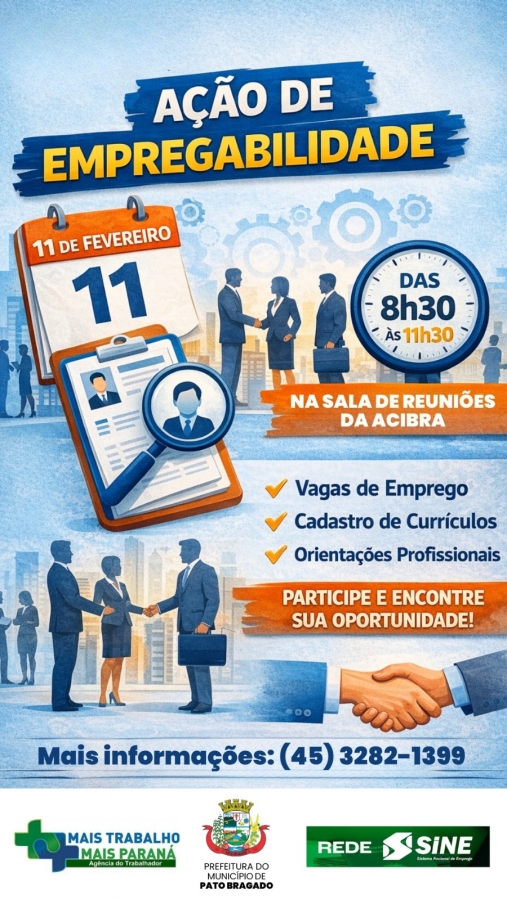 A Agência do Trabalhador de Pato Bragado realizará, no próximo dia 11 de fevereiro de 2026, a Ação de Empregabilidade. O objetivo é convidar empresas e trabalhadores a participarem de um processo de intermediação de mão de obra, promovendo a aproximação entre quem oferta e quem busca oportunidades de trabalho, contribuindo para o fortalecimento da economia local.