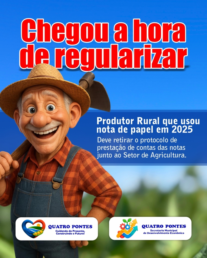 A Prefeitura de Quatro Pontes informa que, desde 1º de janeiro de 2026, está em vigor o novo modelo de Nota Fiscal de Produtor Eletrônica (NFP-e), que substitui definitivamente os antigos talões de notas fiscais em papel.