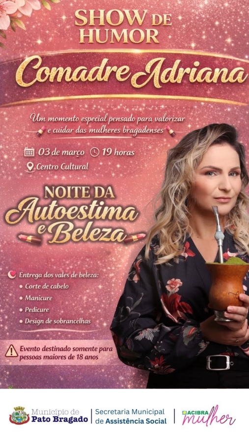A primeira delas será no dia 3 de março, às 19h, no Centro Cultural Arte e Encanto, com show humorístico da Comadre Adriana e a Noite da Beleza, incluindo distribuição de vales para serviços como manicure, pedicure, corte de cabelo e sobrancelhas.