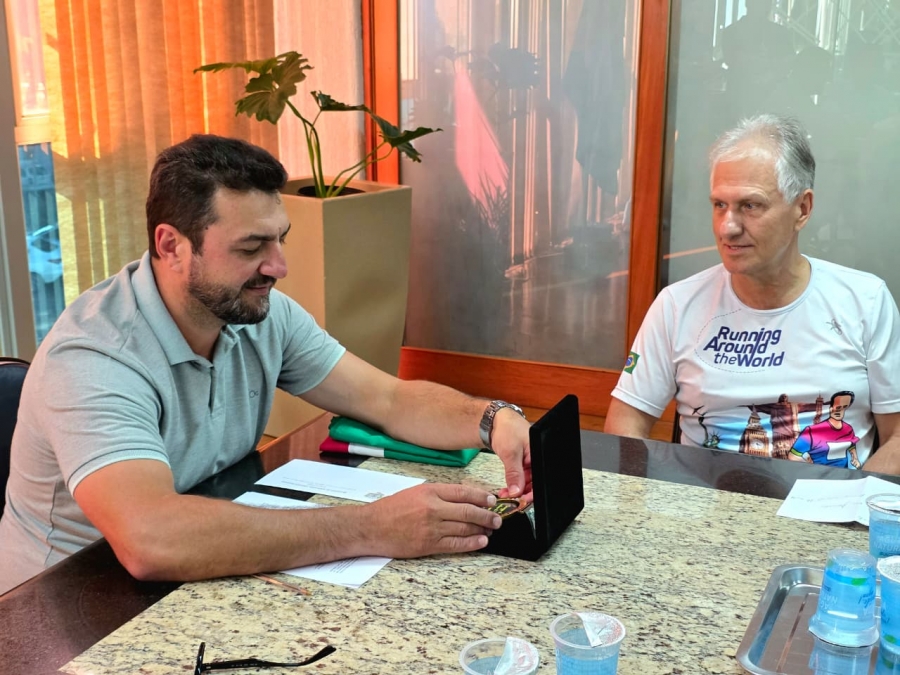 O município também repassou canecas institucionais para serem entregues à autoridade italiana, como lembrança oficial de Marechal Cândido Rondon durante o evento internacional e uma bandeira para ser utilizada pelo corredor na linha de chegada.