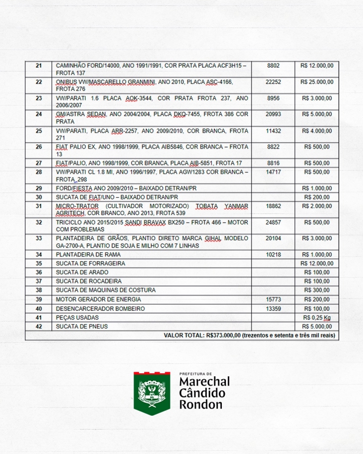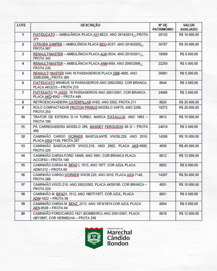 A prefeitura de Marechal Cândido Rondon promoverá leilão público para a alienação de bens móveis inservíveis do município, incluindo veículos, caminhões, máquinas pesadas, equipamentos e sucatas considerados antieconômicos, irrecuperáveis ou obsoletos.