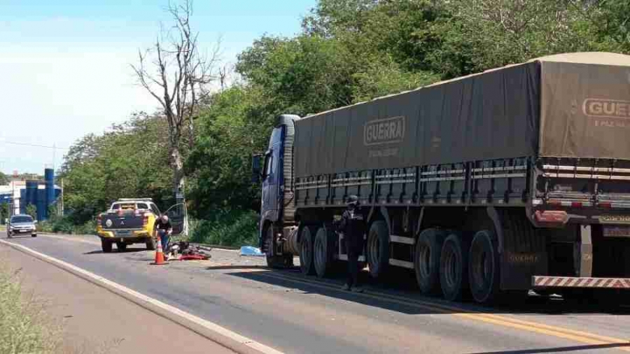 O acidente envolveu motocicleta Honda Biz 125 e carreta Volvo FH440.