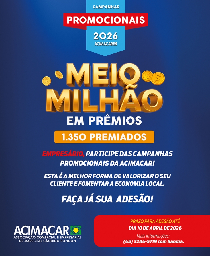 A Associação Comercial e Empresarial de Marechal Cândido Rondon (Acimacar) abriu o período de adesão para suas tradicionais Campanhas Promocionais 2026, uma das maiores ações de incentivo ao comércio local. Neste ano, as campanhas irão distribuir novamente R$ 500 mil em vales-compras, premiando 1.350 consumidores que realizarem compras nas empresas participantes.