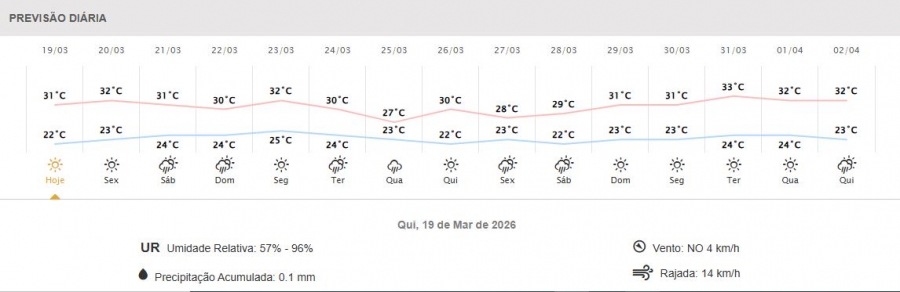 “A formação e permanência de um sistema de alta pressão nos médios e altos níveis da atmosfera, centrada entre o Mato Grosso do Sul e o sul do Brasil ao longo dos próximos dias (especialmente entre os dias 20 e 23 de março), inibe a formação de nuvens nessas regiões. Com a maior incidência de radiação solar, a tendência é de intensificação do aquecimento nessas áreas”, destaca o Inmet na previsão.