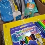 O kit escolar é composto por dois apontadores, duas borrachas, quatro lápis, uma caixa de lápis de cor com 12 unidades, um conjunto de giz de cera, régua, tesoura, pasta ofício com elástico, estojo, cola branca, caderno de desenho grande, cinco cadernos brochura, conjunto de canetas hidrográficas e um pincel.