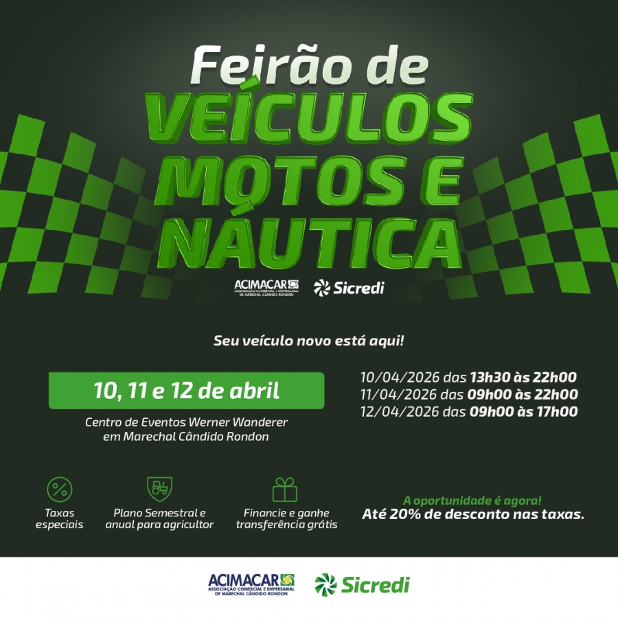 O tradicional Feirão de Veículos Acimacar/Sicredi chega à sua 32ª edição e será realizado nos dias 10, 11 e 12 de abril, no Centro de Eventos Werner Wanderer, em Marechal Cândido Rondon. O evento reunirá empresas do setor de automóveis, motocicletas e linha náutica, oferecendo aos consumidores condições especiais para a compra ou troca de veículos.