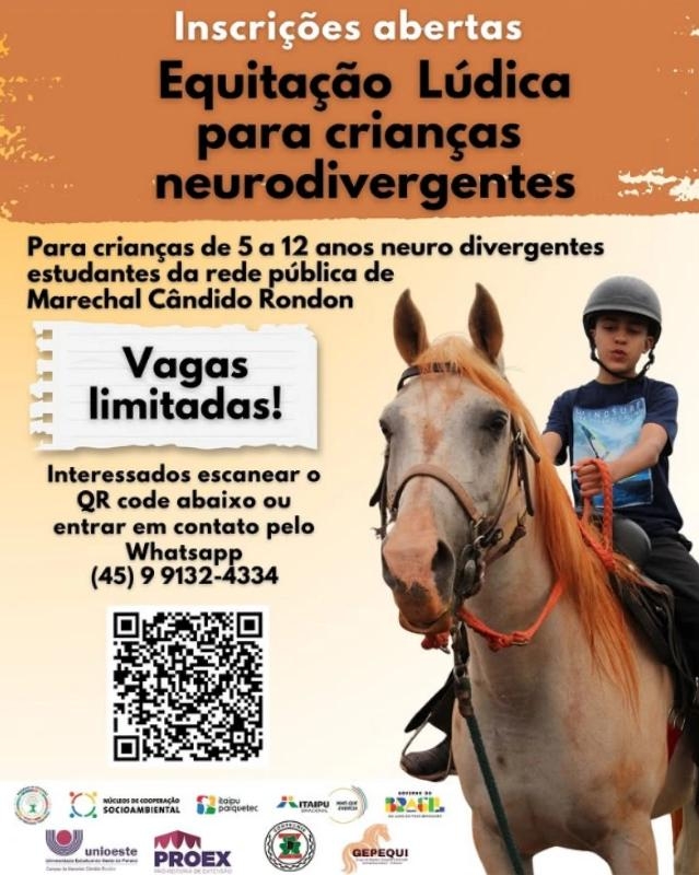 Estão abertas as inscrições para o projeto “Uso lúdico e terapêutico do cavalo para crianças neurodivergentes”, uma iniciativa que une saúde, desenvolvimento e contato com a natureza em Marechal Cândido Rondon. O projeto é fruto de uma parceria entre a Unioeste e o Itaipu Parquetec.